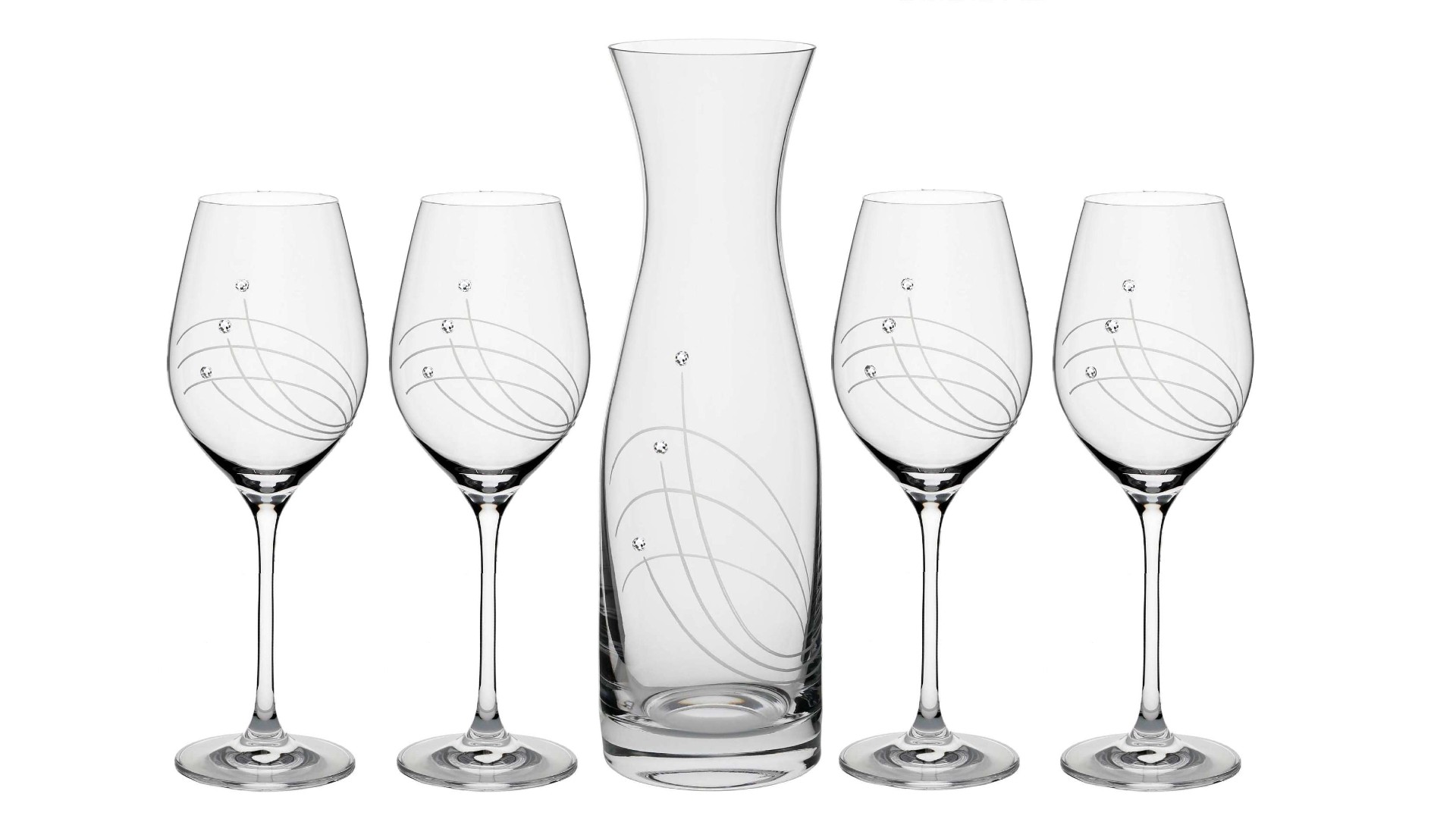 Set fľaša/karafa 1000ml + kalich na víno 360ml z číreho skla, na stopke, s kryštálikmi SWAROVSKI. Každý kalich a flaša obsahuje tri kusy SWAROVSKI kryštálikov.